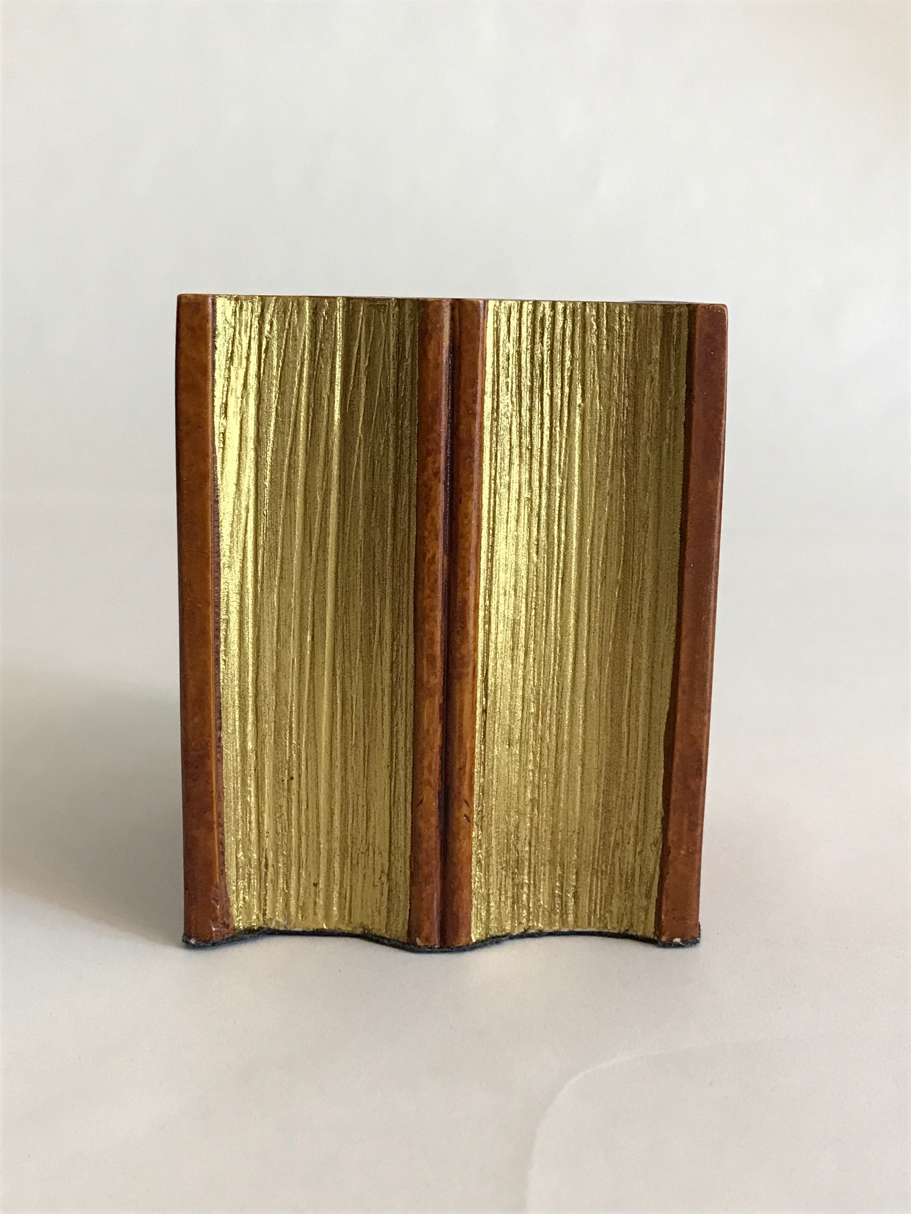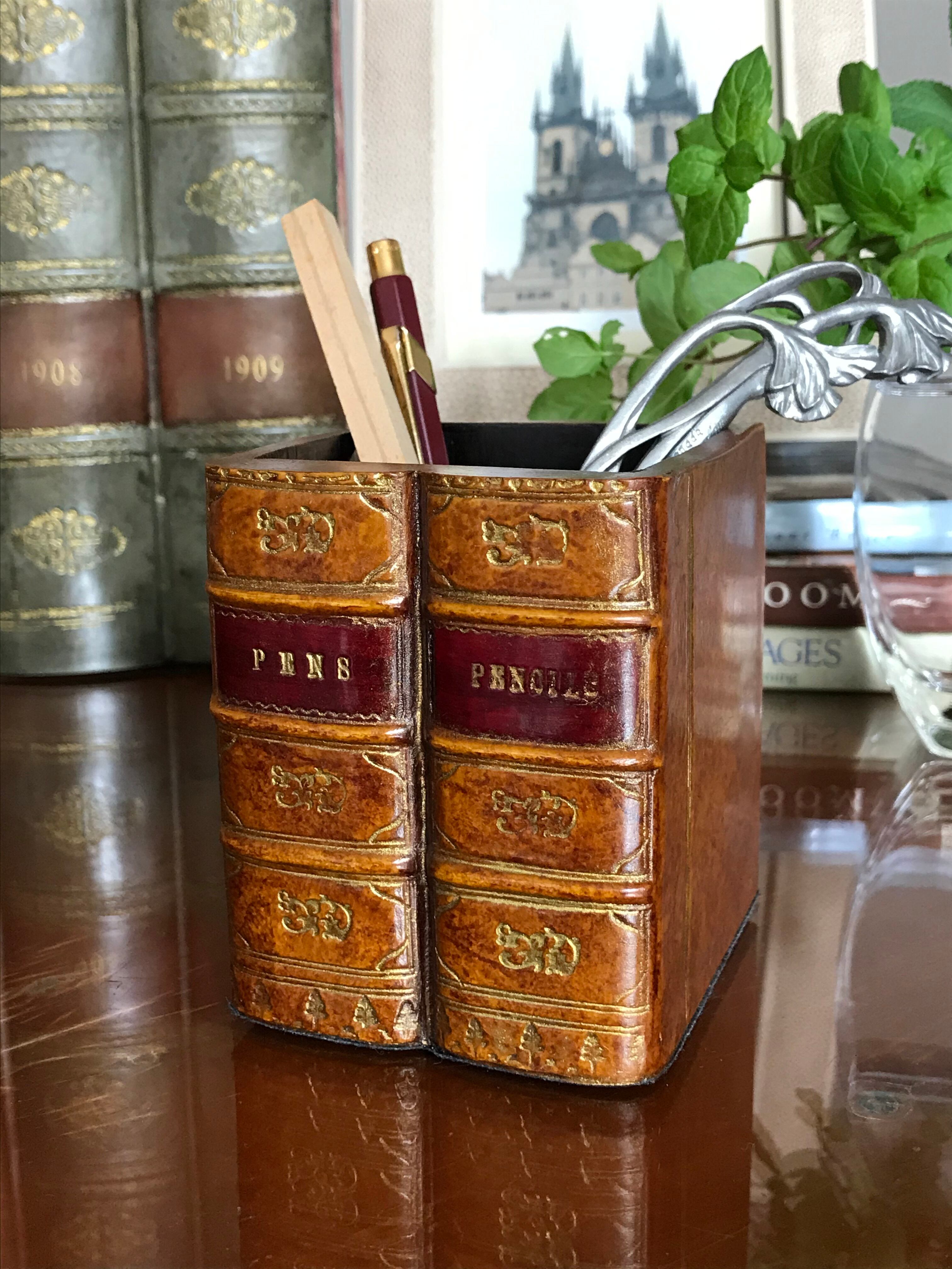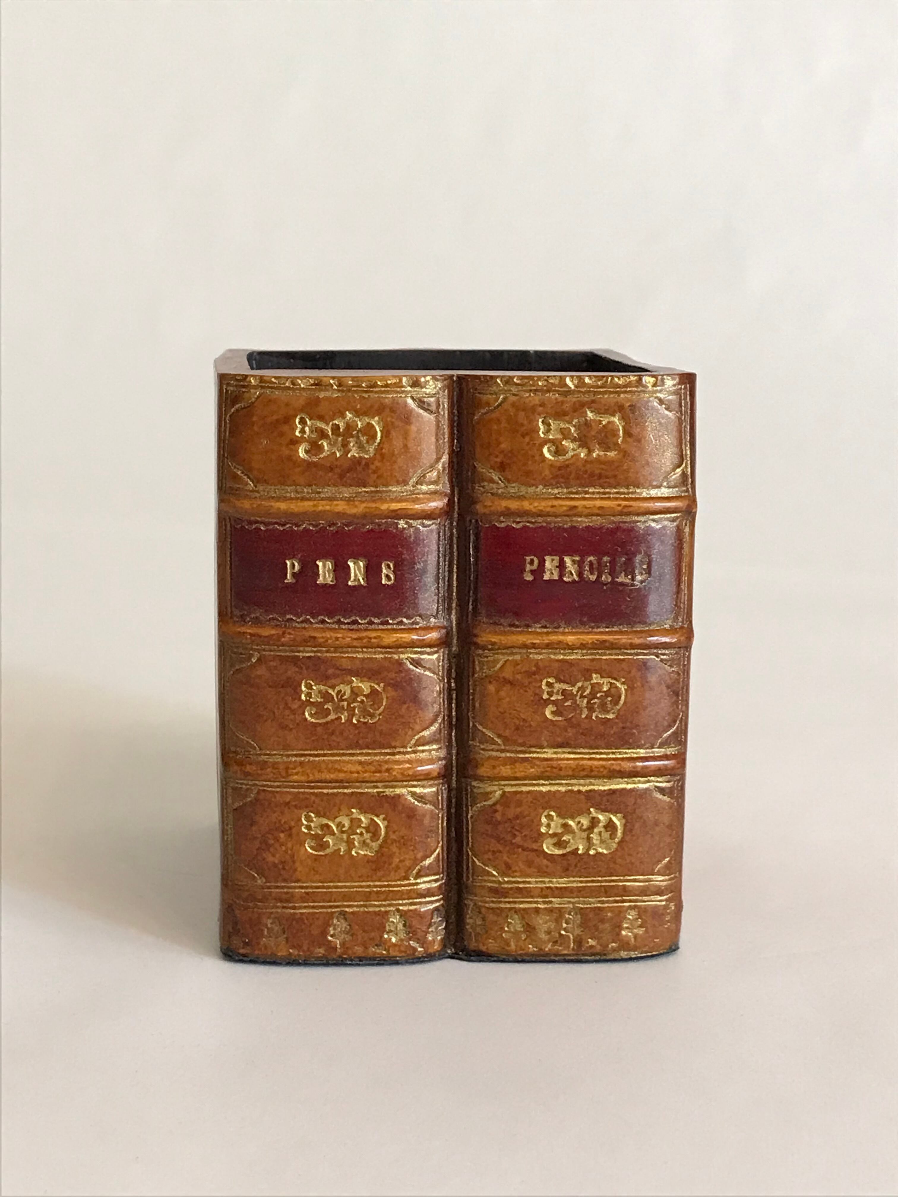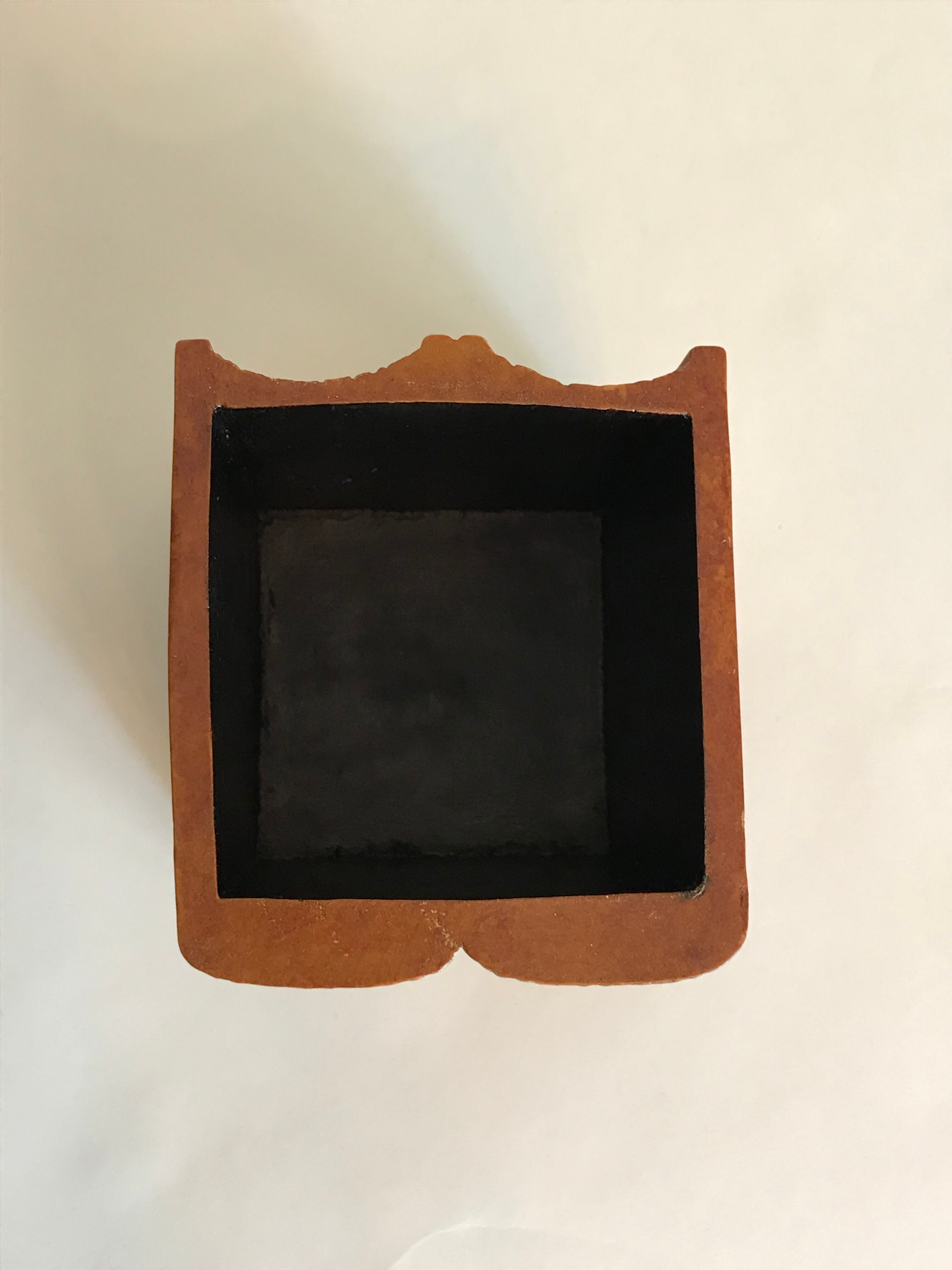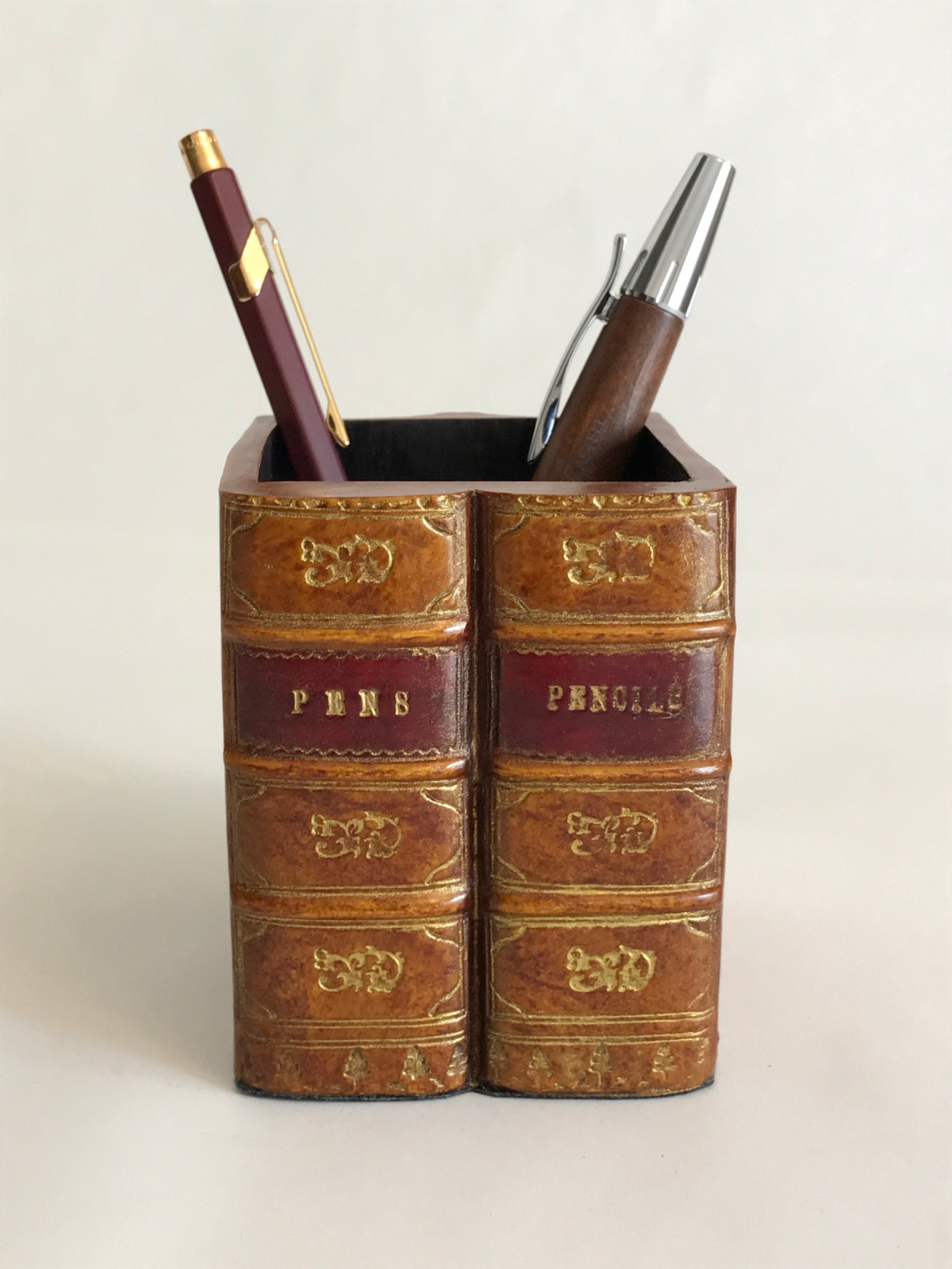存在感のある小さくてもしっかりとした手彩色の仕上げが際立つ一品です。おさまりのいい角形ペン立て。