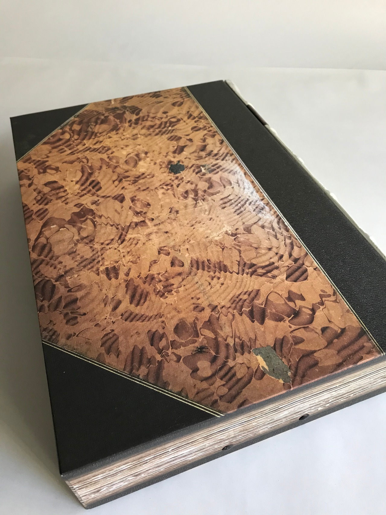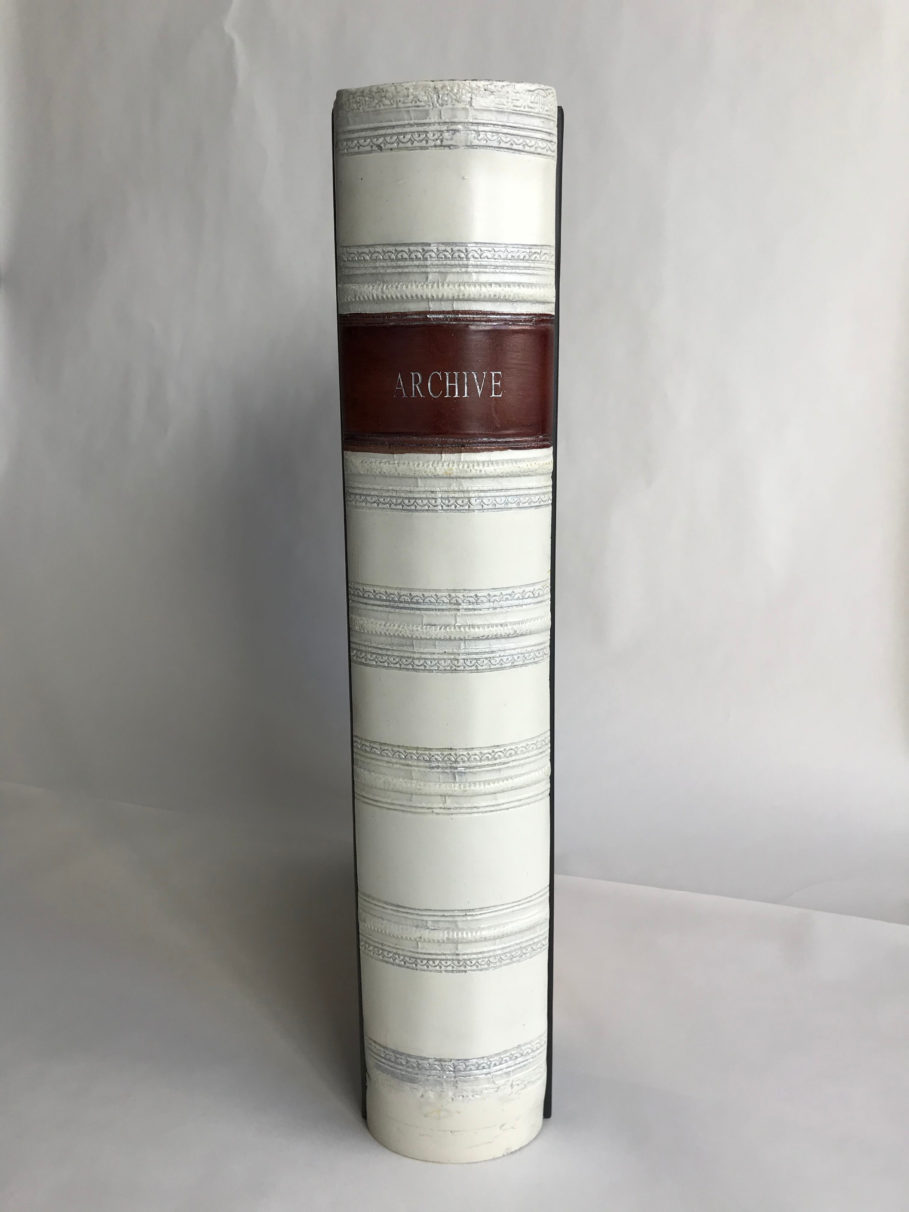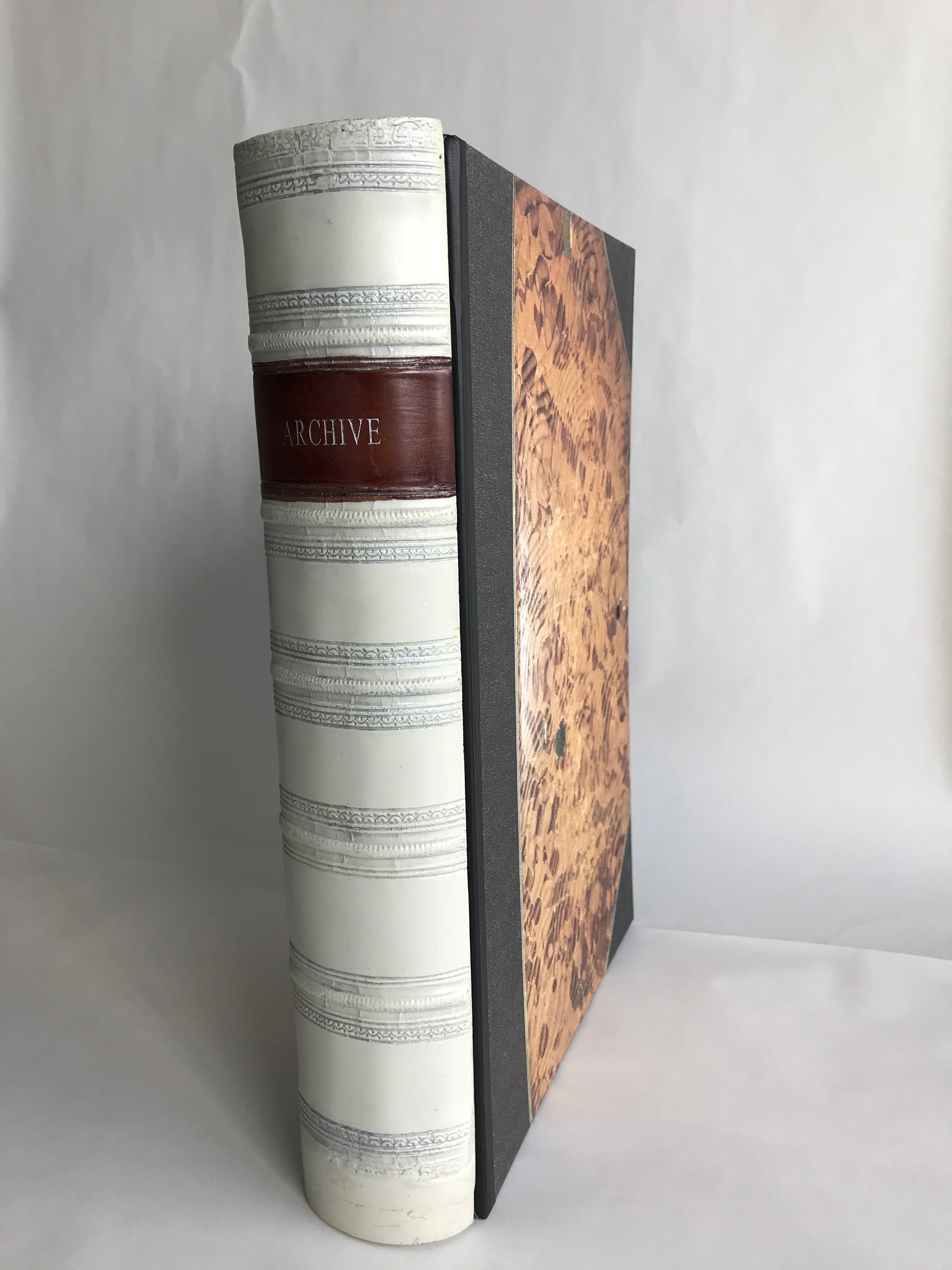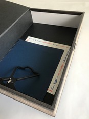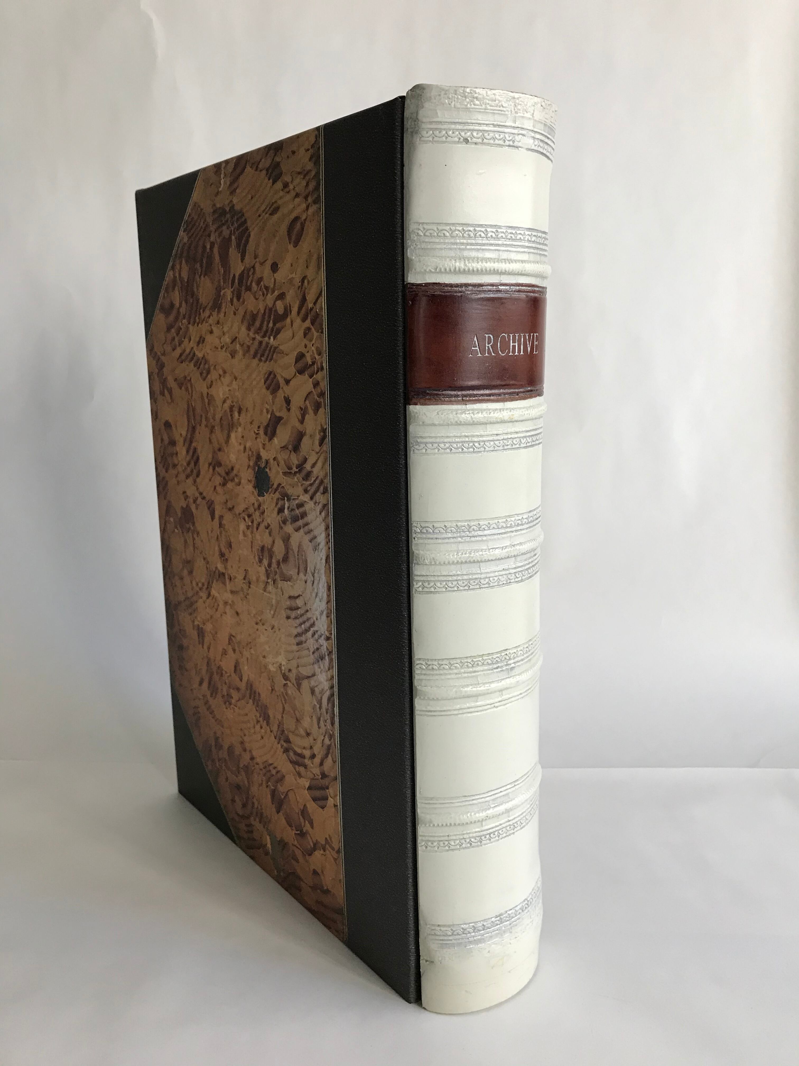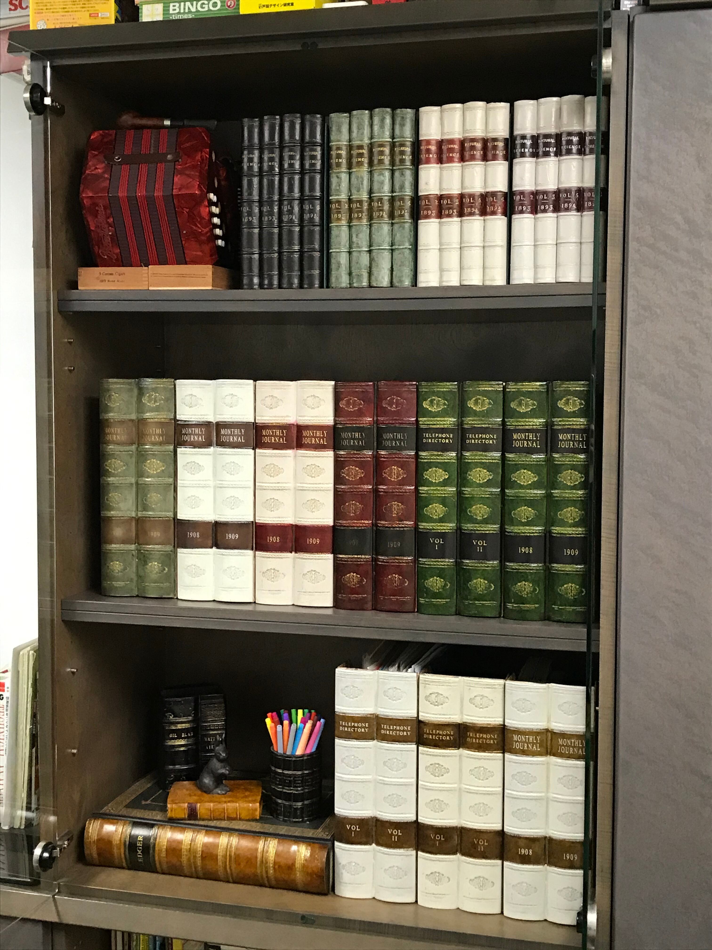 このボックスファイルは、雑多になってしまう書類や領収書などをまとめてしまうことができ、そのまま収納棚や本棚へ置くことにより古い洋書が並んでいるように収まります。横置きにしても素敵です。